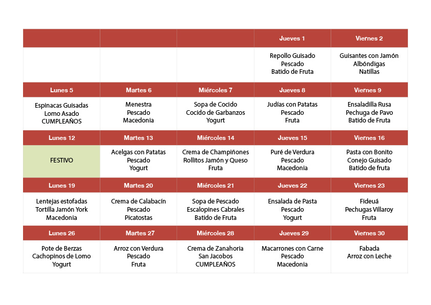 En este mes de octubre, el equipo de nutrición y cocina ha decidido elaborar un menú en el que se aprovecha la entrada del otoño con productos de esta temporada.