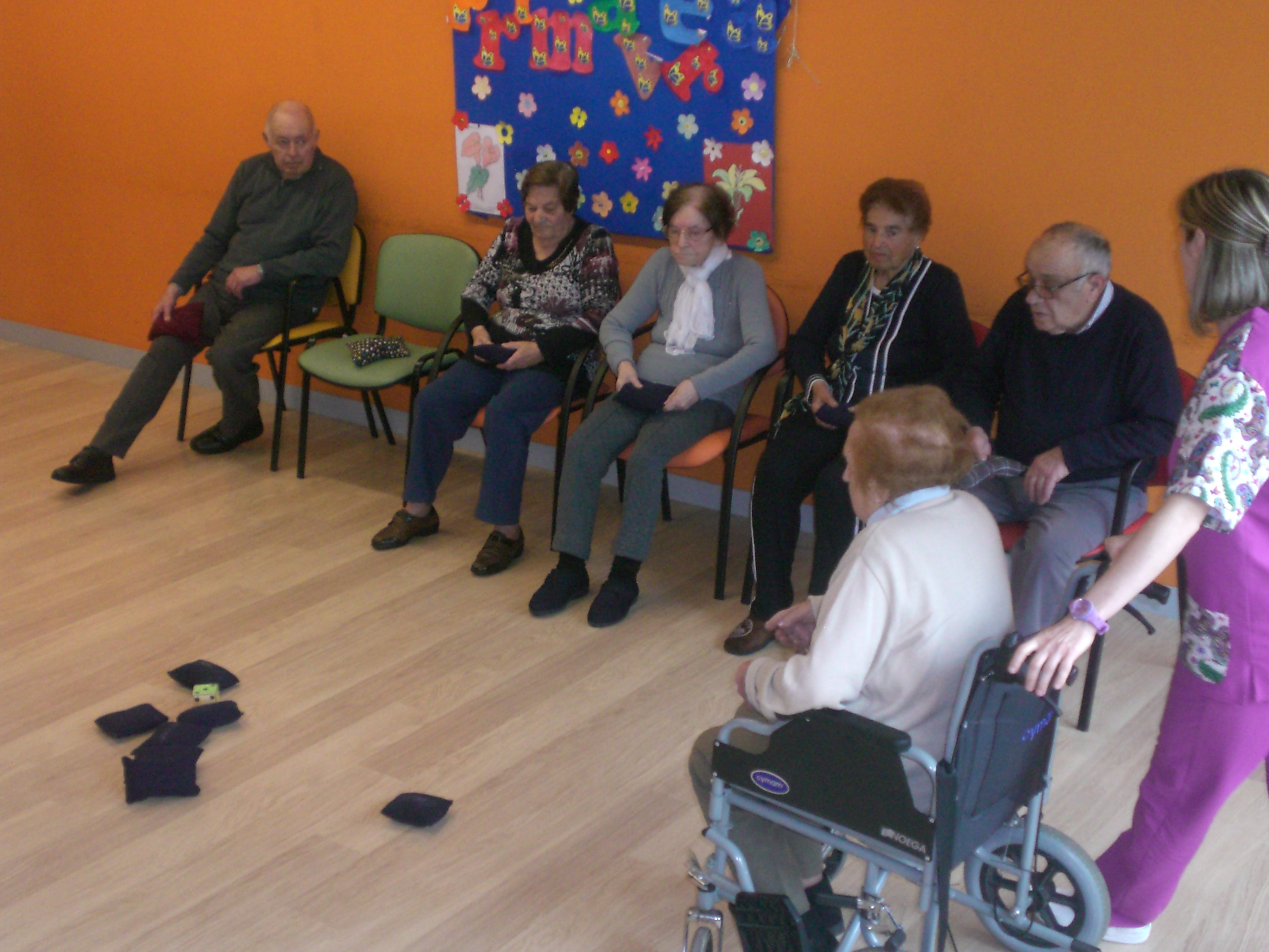 El pasado viernes empezamos jugando a la petanca con materiales adaptados. Marcamos como testigo un dado, y en vez de bolas, lanzamos unos sacos hechos con recortes de periódico que previamente los propios usuarios realizaron como manualidad. Mediante esta actividad trabajamos la motricidad, la atención y la elaboración de estrategias.