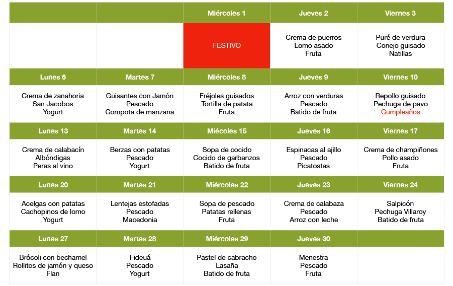 Como ya viene siendo habitual el menú de este mes otorga una gran importancia a las verduras, al pescado y a la fruta, alimentos indispensables en cualquier dieta. Además nos ocupamos de que todas y cada una de las recetas que elaboramos den como resultado un plato rico y apetecible para nuestros usuarios. Además de todo esto el viernes 10 de noviembre ha sido el día elegido para celebrar los cumpleaños de este mes. Una jornada que siempre hacemos que resulte especial y con la que los usuarios pueden disfrutar de una pequeña fiesta de celebración.