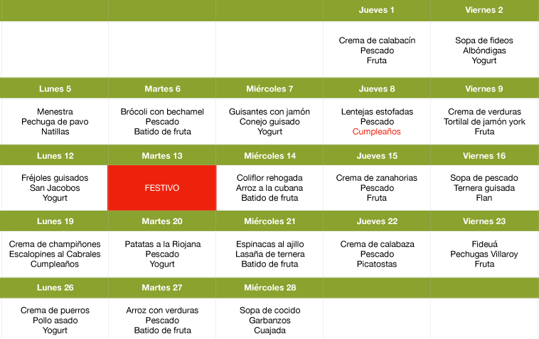 Como todos los meses, desde el Centro de Día Sonraíz os presentamos el menú para las próximas semanas. De esta forma los familiares podrán saber qué van a comer los usuarios cada día, y así prever las cenas con anticipación para no repetir ingredientes.