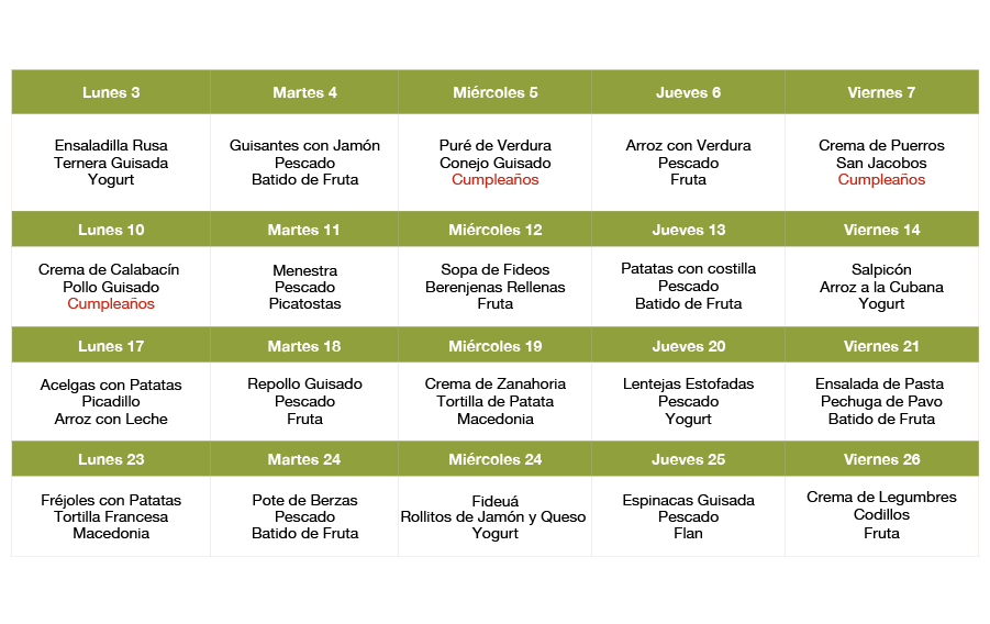 Le damos la bienvenida al mes de septiembre y a sus nuevos productos de temporada en las cocinas del centro de día Sonraíz . A lo largo de este mes nuestro usuarios tendrán una selección de platos completos y muy nutritivos, y como siempre os recordamos, con productos comprados en el mercado local. Este es nuestro menú diario para este mes: