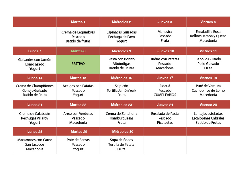 Un mes más apostamos por un menú saludable, rico y variado que cubra las necesidades nutricionales de los usuarios del centro. A continuación os dejamos los diferentes platos que se servirán en la mesa de Sonraíz durante el mes de septiembre.