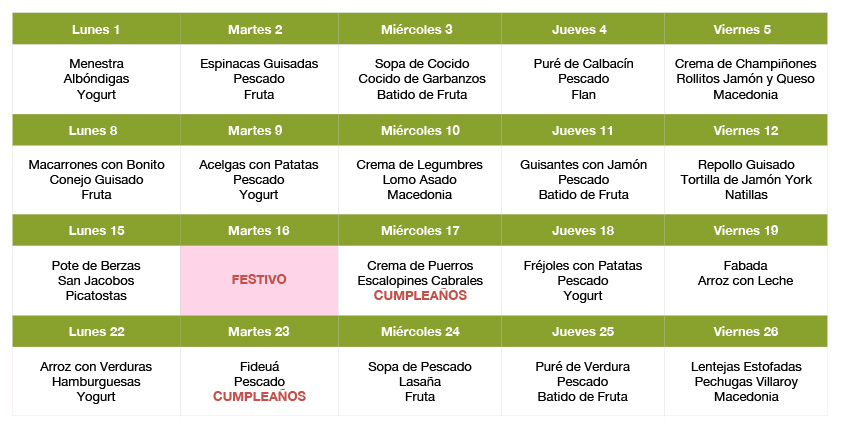 Además este mes el Antroxu y sus picatostes estarán presentes en la mesa, como puedes ver en la tabla.
