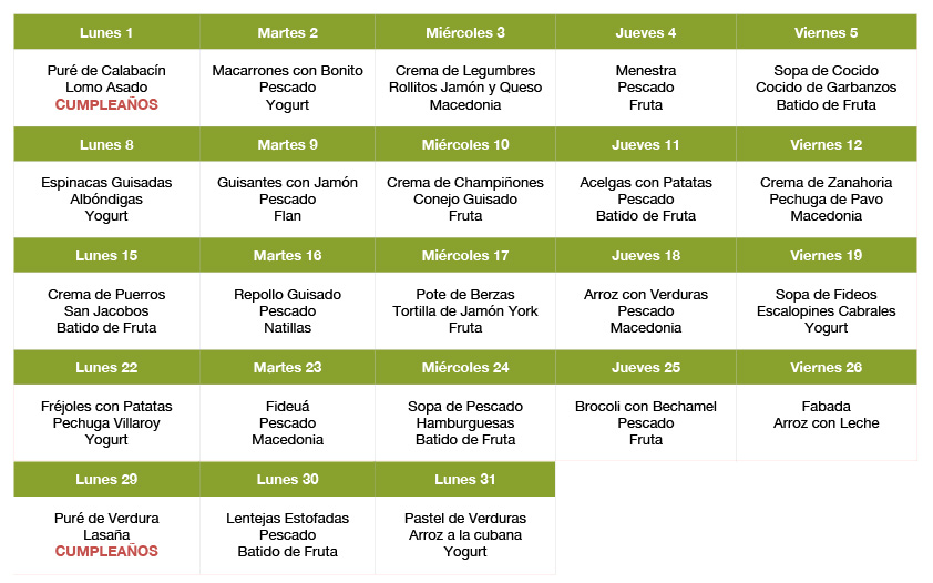 Los menús se adaptan a los usuarios con necesidades específicas y alergias. Como siempre te decimos, si quieres comentar con nosotros cualquier aspecto de este menú o del funcionamiento del centro de día no tienes más que contactar a través del teléfono 984 491 822 o del correo electrónico Esta dirección de correo electrónico está siendo protegida contra los robots de spam. Necesita tener JavaScript habilitado para poder verlo..