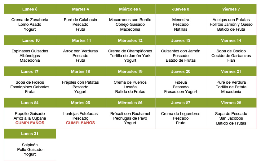 Verduras, hortalizas y proteínas animales. Ese es el resumen del menú que han elaborado para este mes los nutricionistas y el equipo de cocina de Sonraíz. Platos variados que aportan los nutrientes necesarios para que nuestros usuarios mejoren su calidad de vida y a la vez disfruten del mejor sabor. A continuación tienes los menús diarios que ofreceremos en nuestro comedor en las próximas semanas.
