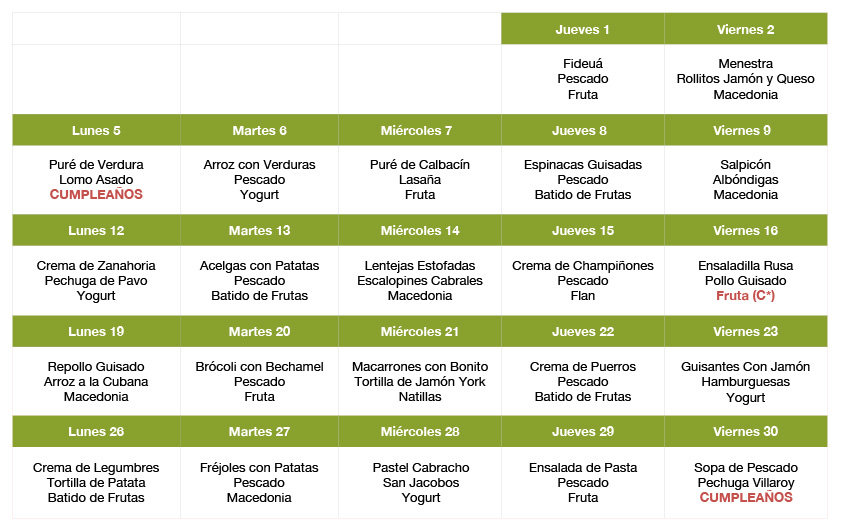 Tanto el equipo de nutrición como el de cocina de Sonraíz trabajan y elaboran los menús diarios pensando en las necesidades nutricionales de los usuarios. Pero también es cierto que en estos meses de verano hay que hacer una combinación con alimentos refrescantes y platos que no resulten muy pesados para evitar problemas con el calor. Teniendo en cuenta todo esto, así ha quedado planificado el menú semanal de julio.
