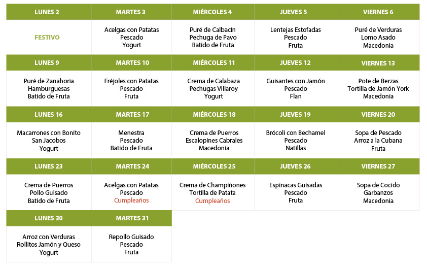 En el menú se incluyen verduras, como los fréjoles, los guisantes, el brócoli o las acelgas; carnes sabrosas y nutritivas, a la vez que sanas como el conejo o el cerdo, y postres variados, basados en la fruta o en los lácteos.