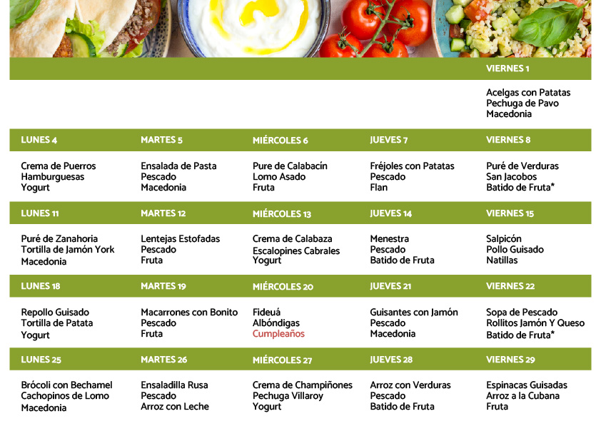 Llevar una dieta variada y equilibrada es fundamental, por eso cada mes estudiamos las necesidades de los usuarios de Sonraíz ofreciéndoles un menú atractivo con productos frescos y de temporada.