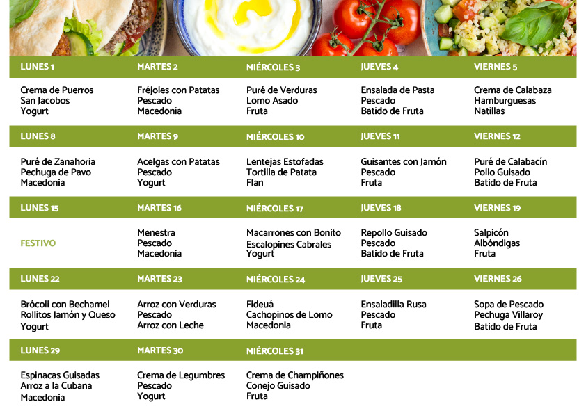 Las altas temperaturas de este verano han llevado a nuestro equipo de nutrición y de cocina a elaborar un menú más fresco, con platos variados y mucha fruta y ensaladas. En el Centro de día Sonraíz también vamos a preparar muchos líquidos, ya que es más importante aún la hidratación en estas fechas. Este es nuestro menú de agosto.