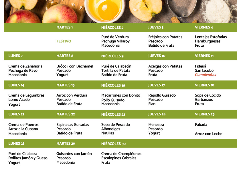 Para ello, Conchita, nuestra cocinera junto con la nutricionista elaboran el menú del mes con los productos más frescos de la temporada.