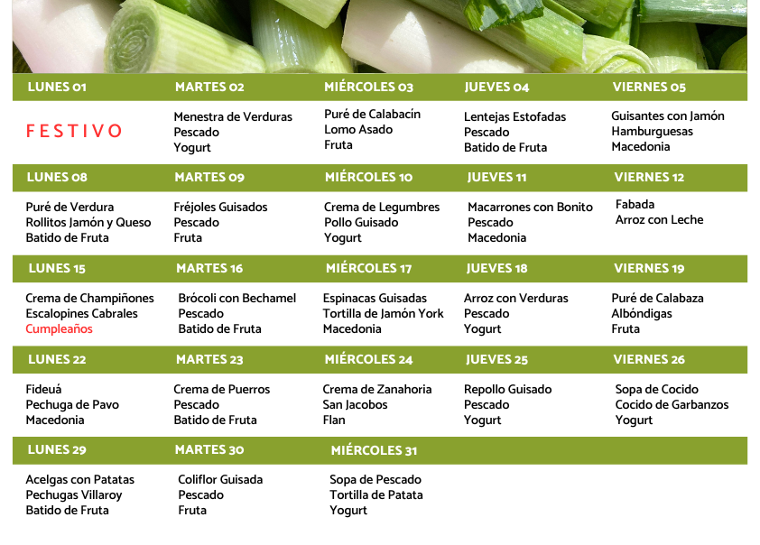 Como cada mes, compartimos nuestro menú. Y es que en Sonraíz consideramos que una alimentación equilibrada conduce a un correcto estado nutricional y a una mejora de calidad de vida.